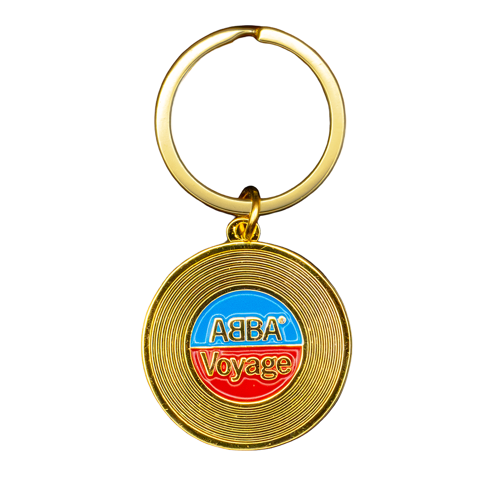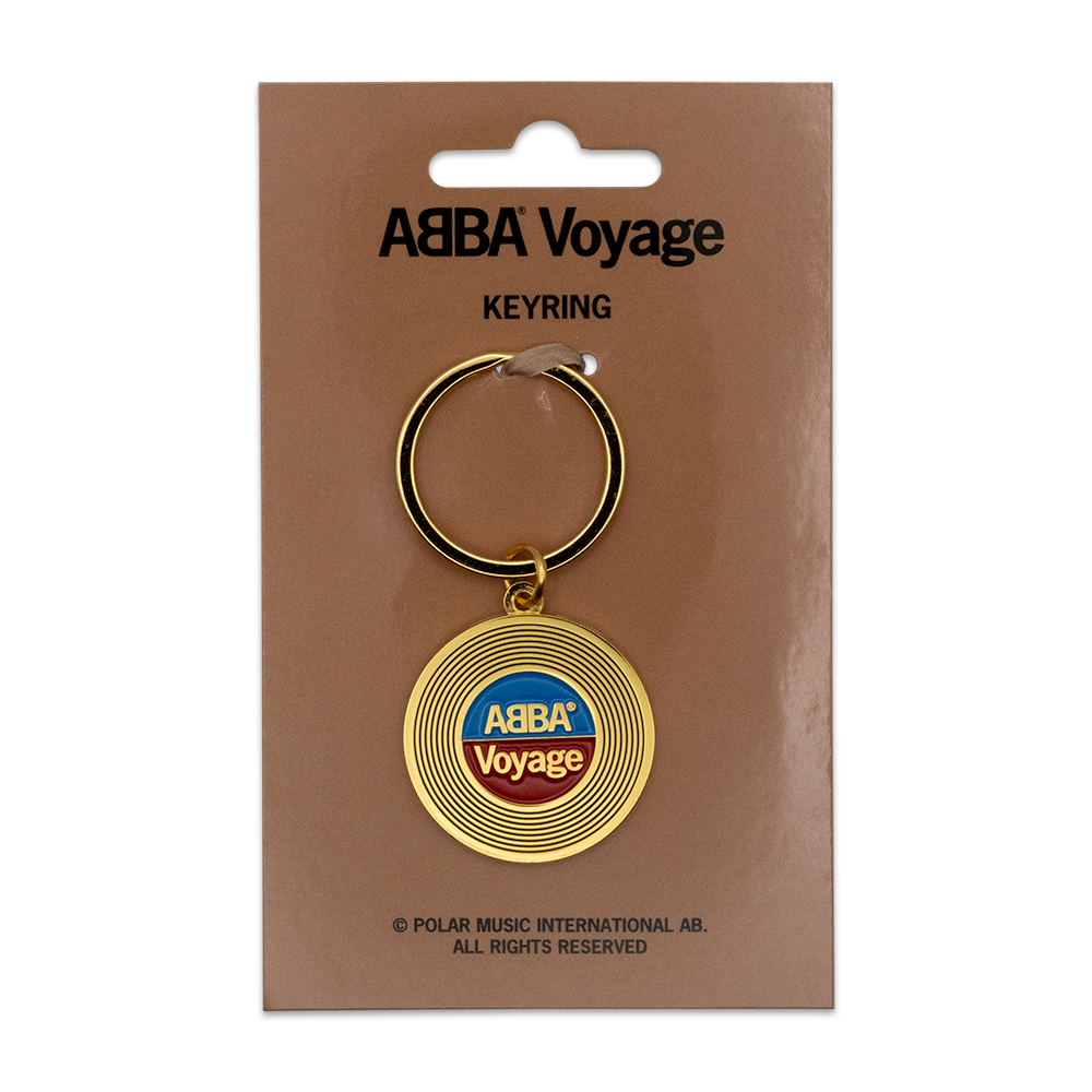 Gold enamel vinyl keychain with ABBA Voyage logo on branded backing card.